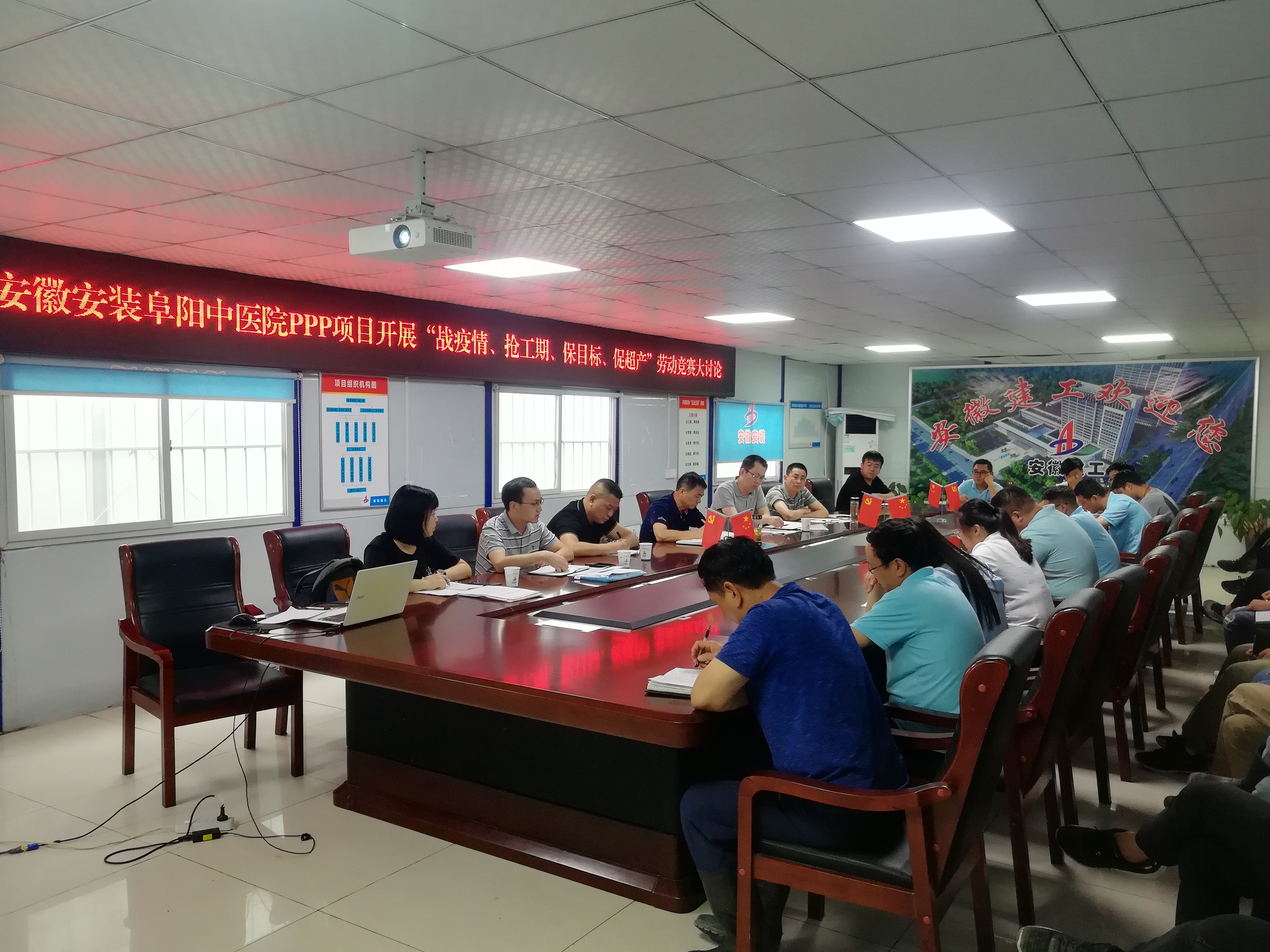 為認真貫徹公司“戰疫情、搶工期、保目標、促超產”勞動競賽活動精神,7月12日下午,公司紀委書記、工會主席李寬旭,副總經理王軍一行在阜陽潁東區中醫院項目部會議室,組織開展“戰疫情、搶工期、保目標、促超產”勞動競賽大討論,分公司領導班子成員、項目部全體人員30余人參加了會議,會議由李寬旭主持。