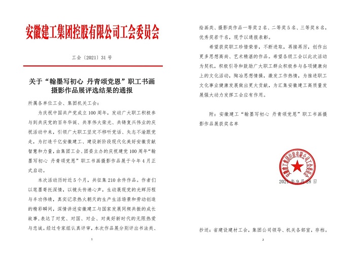 9月29日,集團公司工會通報了“翰墨寫初心 丹青頌黨恩”職工書畫攝影作品展評選結果,安徽安裝公司選送的五幅作品榜上有名。其中馬金鑫的油畫作品《支部建在項目上》榮獲繪畫類一等獎,任禹豪的攝影作品《幸福是干出來的》榮獲攝影類二等獎,化范寶的硬筆書法作品《沁園春·雪》和程茂麗的攝影作品《攀登》、胡欣欣的攝影作品《齊心》分別榮獲書法類優秀獎和攝影類優秀獎。