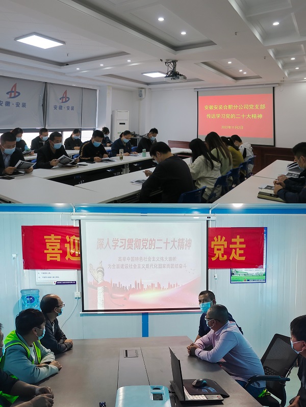 11月2日,安徽安裝合肥分公司黨支部召開黨員大會,專題學習黨的二十大精神。分公司黨支部堅持黨建引領,把學習好、宣貫好黨的二十大精神作為當前和今后一個時期的首要政治任務,通過班子理論學習會、支部“三會一課”、黨員活動日等多種形式,以及微信公眾號、網站、宣傳欄、橫幅標語等多種載體,加大對黨的二十大精神宣貫力度,弘揚偉大建黨精神,用先進的理論武裝頭腦,指導實踐,推動工作,以優異的成績推動黨的二十大精神在基層落地生根、開花結果,為推動安徽安裝“十四五”高質量發展而不懈努力。