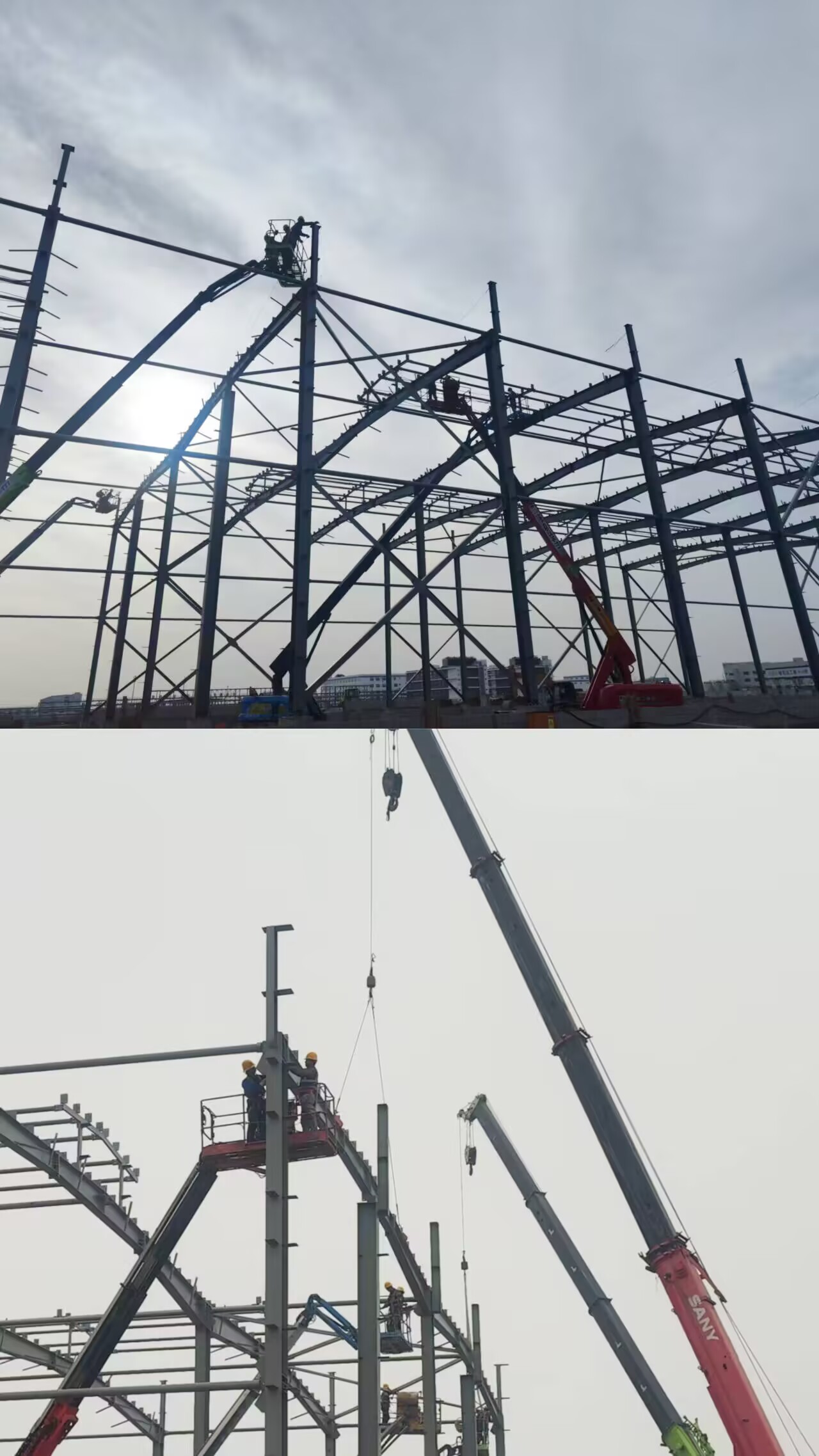 走進項目施工現場,起重機揮動著粗壯的鋼鐵臂膀劃破天際,將一段段鋼梁精準的吊裝至安裝位,曲臂車托舉著工人將鋼構件嵌入到預定位置,保障高空作業人員的生命安全。這是力量與技術的二重奏,更是安全與效率的完美平衡,一幅現代工業建筑的壯美畫卷正徐徐展開。